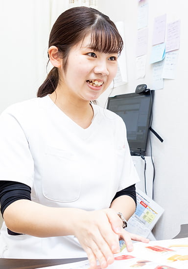 私自身、病気で医療に助けられた経験があって、そこから医療を行う人たちに恩返しがしたい、人と接することが好きな性格を活かして人の役に立つ仕事がしたいと考え、縁あってこちらのクリニックで働くことになりました。このクリニックの魅力は、先生方が優しく温かい雰囲気であり、患者さまへ親切に接しているところです。スタッフのチームワークが良く、良い病院になるようスタッフ全員が努力しているところもポイントですね。